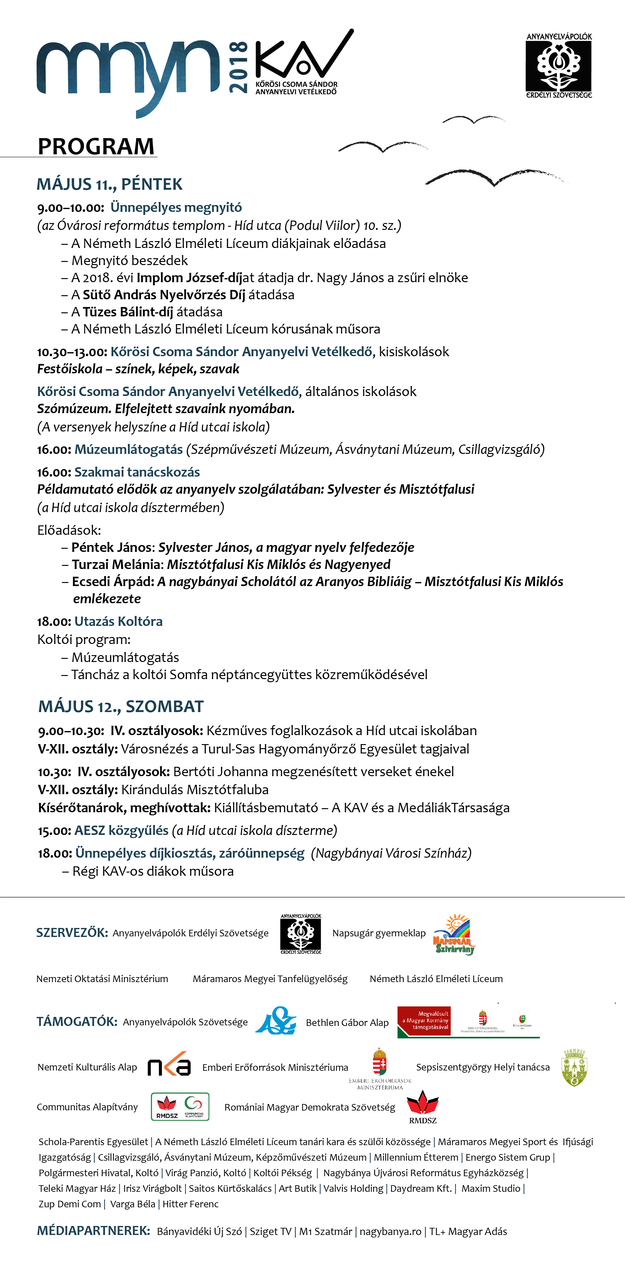 HírekA Magyar Nyelv Napjai 2018Idén A Magyar Nyelv Napjai 2018. május 10. és 13. között Nagybányán kerül megrendezésre. A rendezvény keretében kerül sor a Kőrösi Csoma Sándor Anyanyelvi Vetélkedőre, a Példamutató elődök az anyanyelv szolgálatában: Sylvester és Misztótfalusi című konferenciára, az AESZ soros tisztújító közgyűlésére, és itt adjuk át a 2018-as Sütő András Nyelvőrzés Díjat és a Tüzes Bálint-díjat. A rendezvény programja: