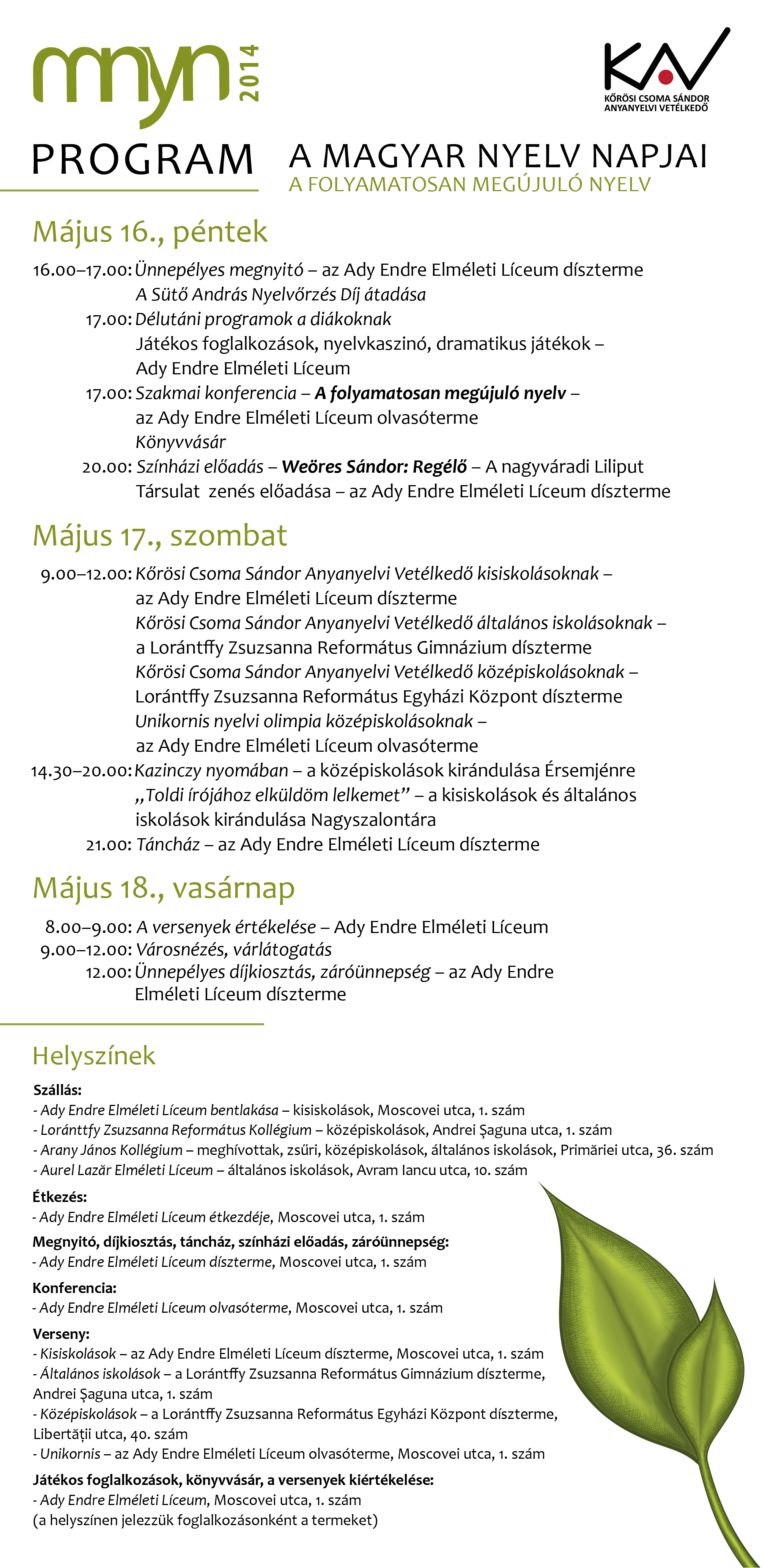 Ünnepélyes hangulatú zenés, verses összeállítással kezdődött 2014. május 16-án az Anyanyelvápolók Erdélyi Szövetsége nagy tavaszi rendezvénye, A Magyar Nyelv Napjai, amelynek idén házigazdaként a nagyváradi Ady Endre Elméleti Líceum adott otthont. Köszöntőt mondott Tóth Márta, a vendéglátó tanintézmény igazgatója, Nagy Éva, a bukaresti Nemzeti Oktatási Minisztérium államtitkári kabinetigazgatója, Bíró Rozália Bihar megyei szenátor, Bencze Lóránt, a Magyar Nyelvstratégiai Intézet vezetője és Zsigmond Emese, a Napsugár gyermeklap főszerkesztője. A rendezvényt hivatalosan Péntek János, az AESZ elnöke nyitotta meg. Az ünnepélyes megnyitó fénypontja volt a Sütő Andrásról elnevezett Nyelvőrzés Díja átadása, amelyet 2014-ben Szilágyi Aladár helytörténész, publicista, szerkesztő kapta. Idén, a díj átadásának történetében először, az Anyanyelvápolók Erdélyi Szövetsége posztumusz kitüntetésben részesítette a nagyváradi tanár, újságíró, költő Tüzes Bálintot. A háromnapos rendezvény gazdag programot kínált a résztvevőknek: versenyzőknek és kísérő tanároknak. A megnyitó után a diákok játékos foglalkozásokon és dramatikus játékokon vettek részt, a pedagógusok és meghívottak részére szakmai konferenciát szerveztünk A folyamatosan megújuló nyelv címmel. Este a nagyváradi Szigligeti Színház Liliput Társulata Weöres Sándor: Regélő című zenés előadását mutatta be a résztvevőknek. Másnap a Kőrösi Csoma Sándor Anyanyelvi Vetélkedőn három korosztályban több mint százötven diák mérte össze tudását, anyanyelvi műveltségét. Az erdélyi versenyzőkön kívül idén magyarországi csapatok is részt vettek a vetélkedőn. A IV. osztályosok vetélkedőjét Zsigmond Emese a Napsugár gyermeklap főszerkesztője, az általános és középiskolások vetélkedőjét Magyari Sára és Zsemlyei Borbála vezette, a verseny feladványai, gyakorlatai, kérdései a folyamatosan megújuló nyelv tematikájához kapcsolódtak. Ezzel egyidőben zajlott az Unikornis nyelvi olimpia középiskolásoknak, mely idén először szerepel a rendezvény programjában. A Kádár Edit vezetésével zajló vetélkedő célja a nyelvészet tudományának megismerése, feladatai főként a logikára és kutatásra épülnek. A jó hangulatú, tartalmas versenyeket követően a kis- és általános iskolások Nagyszalontára, a középiskolások Érsemjénre kirándultak. Vasárnap a versenyek kiértékelése és városlátogatás után a záróünnepség keretén belül került sor az ünnepélyes díjkiosztásra.