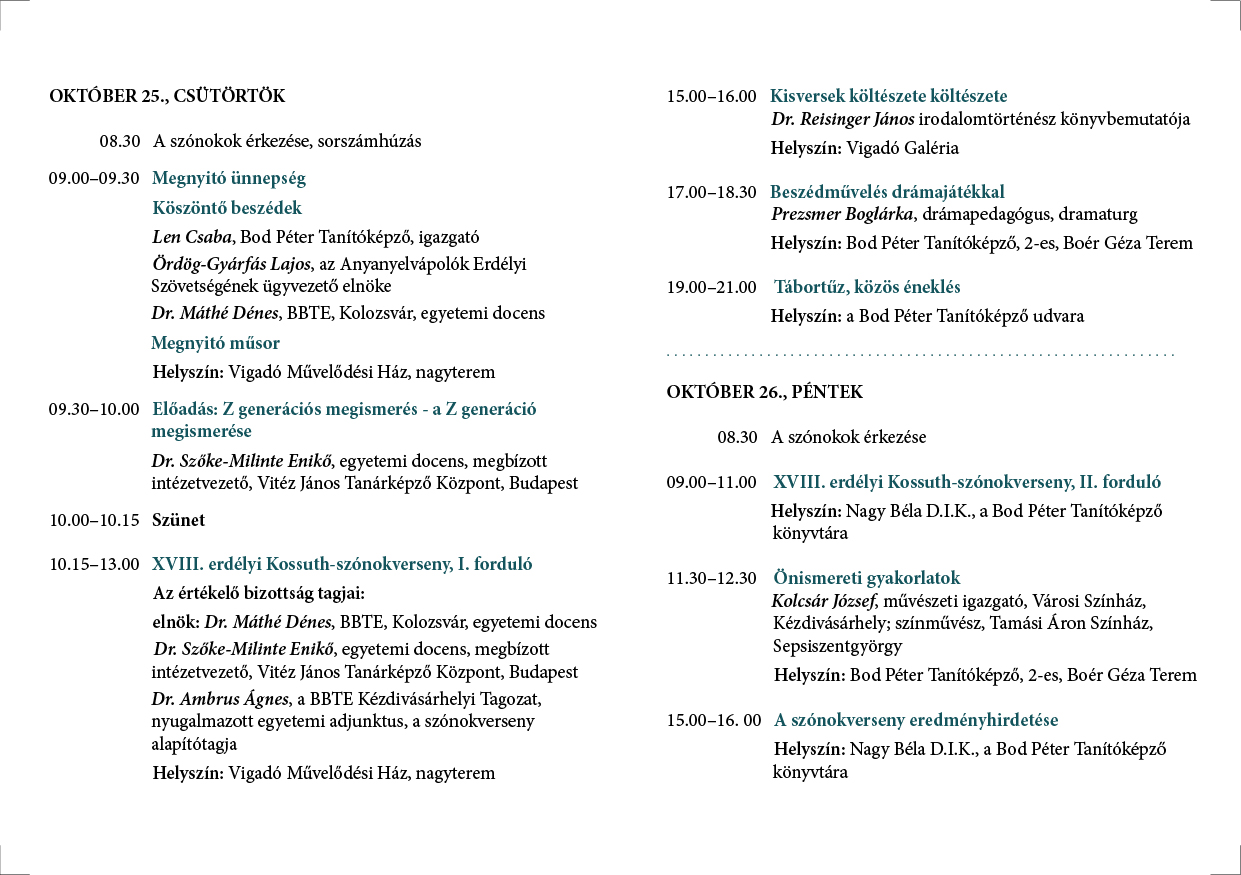 HírekVersenyfelhívások 2018/2019-es tanévErdélyi Kossuth-szónokversenyKriza János Balladamondó, Balladaéneklő és Mesemondó VersenyImplom József helyesírási versenySimonyi Zsigmond helyesírási verseny