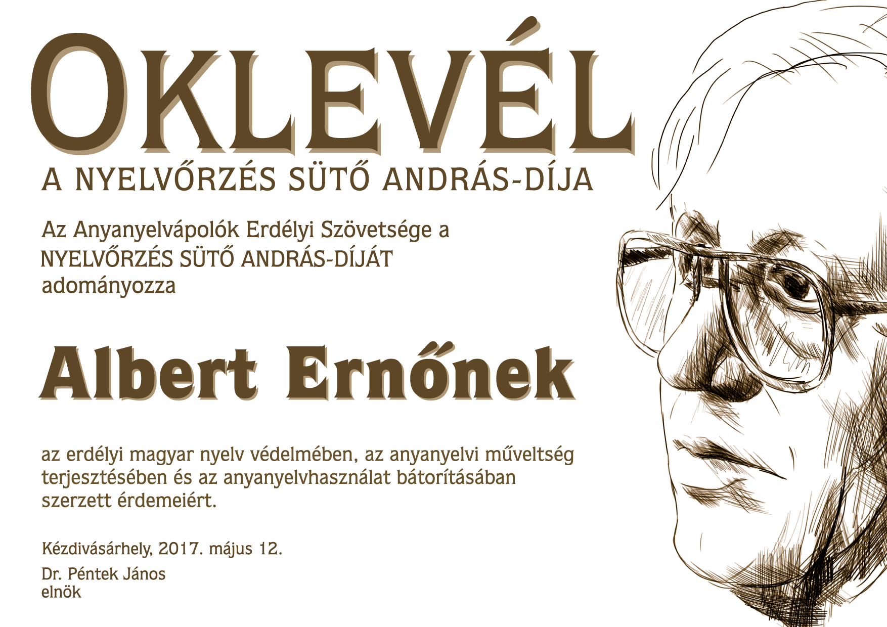 Laudáció Albert Ernőről Az Anyanyelvápolók Erdélyi Szövetsége megalapításának 25. évfordulóján a Sütő Andrásról elnevezett Nyelvőrzés Díjjal ismeri el Albert Ernő nyugalmazott magyartanár, néprajztudós anyanyelvünkért végzett áldozatos munkáját. A díj leírásában ez áll: „Ezt a kitüntetést évente egyszer az AESZ elnöksége ítéli oda olyan nyelvészeknek, nyelvművelőknek, közéleti személyiségeknek, akik a magyar nyelv tisztaságának megőrzéséért, az anyanyelvi kultúra ápolásáért, a magyarul beszélők anyanyelv-használati jogaiért munkálkodtak.”